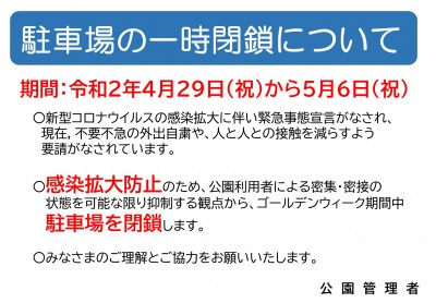 2020年04月28日お知らせ西公園駐車場 一時閉鎖のおしらせ新型コロナウイルス感染症の感染とその拡大防止のため、西公園駐車場を一時閉鎖します。 期間:令和2年4月29日(水・祝)~5月6日(水・祝) ご不便をおかけいたしますが、感染拡大防止のため、ご理解を賜りますよう宜しくお願い申し上げます。