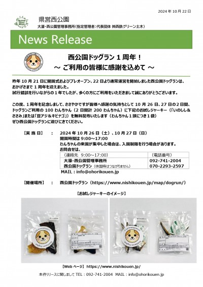 昨年10月21日に開園式およびプレオープン、22日より通常運営を開始しました西公園ドッグランは、おかげさまで1周年を迎えました。
