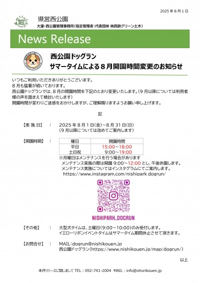 サマータイムによる8月開園時間変更(ドッグラン)のお知らせ