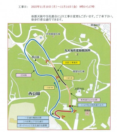 2025年11月01日お知らせ伐採工事に伴う一部車両通行止め及び交互通行のお知らせいつも西公園をご利用いただきありがとうございます。 電柱立替に伴う支障樹木枝の伐採工事のため、 下記の日程で車両通行止め・交互通行になる区間があります。 ご利用の方にはご不便をおかけいたしますが、ご理解の程よろしくお願いします。 工事期間:2025年11月10日(月)~11月14日(金) 9:00~17:00 工事場所:光雲神社西側園路~陸橋下 ※詳細は画像でご確認ください。