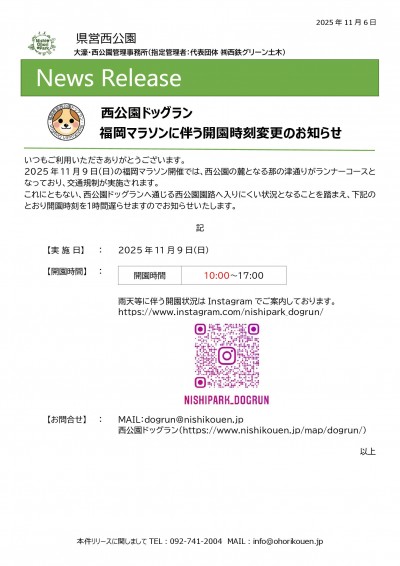 西公園ドッグラン 福岡マラソンに伴う開園時刻変更のお知らせ